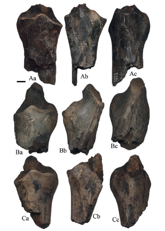 Los fragmentos proximales de radio se encuentran dentro de las medidas aportadas por Dalquest (1980) para Hemiauchenia vera. El fragmento proximal derecho muestra marcas de Gnatichnia posiblemente de cocodrilo, con la tuberosidad lateral y la rugosidad bicipital apenas insinuadas, el foramen interóseo es elongado (Figura 10A). Mientras que los fragmentos de radio izquierdo (Figura 10B y 10C) presentan las superficies lisas con preservación regular, el foramen interóseo es elongado.