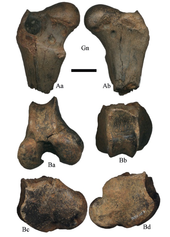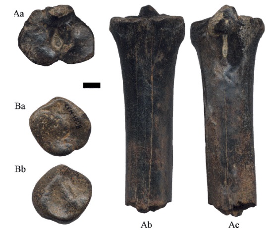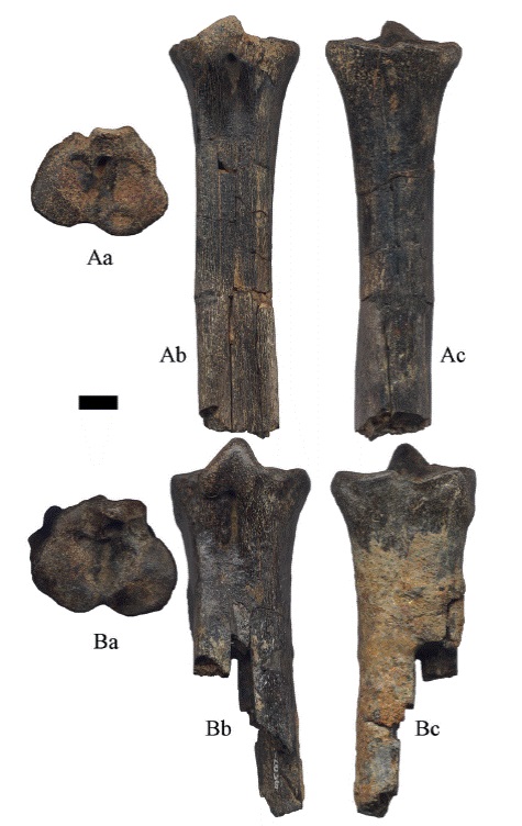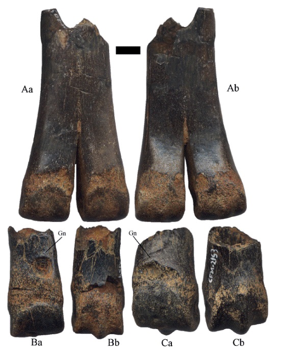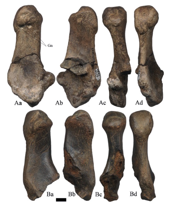 Las superficies articulares distales o cóndilos por lo fragmentado del material es imposible determinar si corresponden a metatarsos o metacarpos. Los ejemplares presentan regular preservación, la superficie de la tróclea es lisa y algunos de ellos tienen marcas de Gnatichnia en la cara anterior (Figura 13B-C, Figura 14B-C).