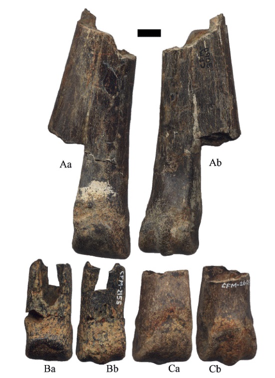 Radios: los CFM-3063 y CFM-3843 corresponden a fragmentos proximales derechos; los CFM-1106, CFM-1520, CFM-2479, CFM2611 y CFM-2836 corresponden a fragmentos proximales izquierdos, el CFM-1107 corresponden a un fragmento proximal izquierdo. Ulnas: los CFM-1194 y CFM-3075 son fragmentos derechos. Huesos carpales: los CFM-3097 y CFM-3487 son escafoides; el CFM-3559 es un unciforme. Metapodiales: los CFM-2153, CFM2154, CFM-2155 y CFM-2608 son superficies articulares distales o cóndilos; los CFM-1001, CFM-1002, CFM-1003, CFM-2034, CFM-3060 y CFM-3296 corresponden a metapodiales. Falanges: El CFM-1863 es una falange I completa; los CFM-1093, CFM-2483, CFM-2487 y CFM-2488 son fragmentos proximales de falanges I posiblemente de individuos juveniles; los CFM-2491, CFM-2609 y CFM-3099 son fragmentos proximales de falange I; el CFM-2783 es un fragmento distal de falange I; los CFM-1864 y CFM-2638 corresponden a falanges II y el CFM2489 a un fragmento proximal de falange II.