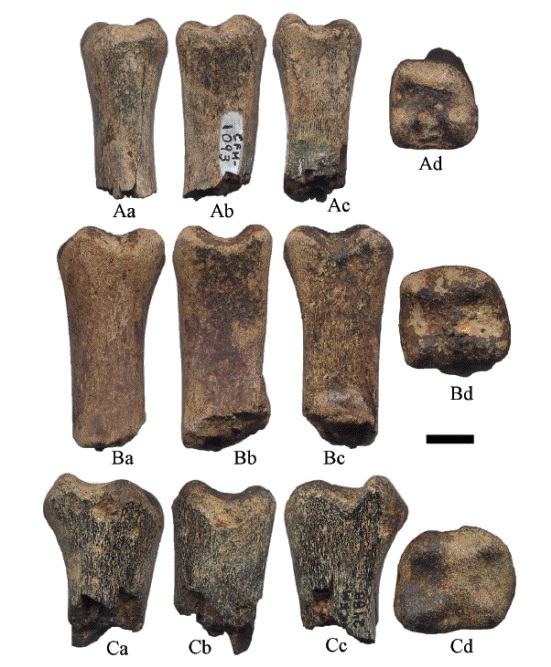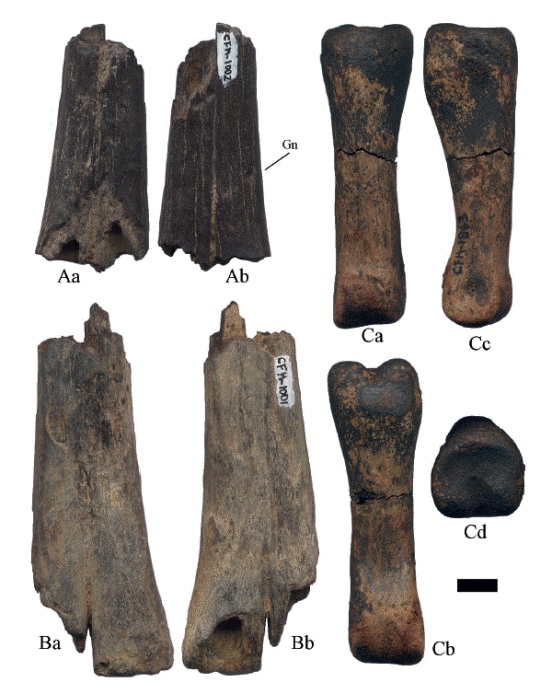 Fémures: el CFM-1006 es un fragmento proximal derecho; el CFM-2999 corresponde a una cabeza de fémur; los CFM-3482 y CFM-3647 son fragmentos distales derechos y el CFM-1706 es un fragmento distal izquierdo. Tibias: los CFM1648, CFM-2492 y CFM-2798 corresponden a fragmentos proximales derechos; los ejemplares CFM-2492 y CFM-2798 posiblemente correspondan a ejemplares juveniles; los CFM-3059 y CFM-3104 corresponden a fragmentos proximales izquierdos de posibles individuos juveniles; los CFM-1715, CFM-2180, CFM-3062, CFM3105 y CFM-3730 corresponden a fragmentos distales derechos y los CFM-1794, CFM-2801, CFM-2838, CFM-3061, CFM-3556 y CFM-3789 a fragmentos distales izquierdos. Huesos tarsales: el CFM-1908 es un entocuneiforme. Astrágalos: los CFM-1004, CFM-1113 y CFM-2835 son derechos; el CFM-1113 posiblemente de un juvenil y los CFM-1005, CFM-1444, CFM-1521, CFM-1691, CFM-2156, CFM-2179 y CFM-3558 son izquierdos; el CFM-1444 se encuentra muy erosionado. Calcáneos: el CFM-1229 es un ejemplar completo y los CFM-2177 y CFM-2551 son fragmentos, todos derechos. El CFM-2954 es un ejemplar completo y los CFM-1303, CFM-2550, CFM-2626 y CFM-3648 son fragmentos, todos izquierdos. Metatarsos: los CFM-2036, CFM2894, CFM-3272, CFM-3557 y CFM-3803 son fragmentos proximales derechos; los CFM-1638 y CFM-1690 son fragmentos proximales izquierdos.