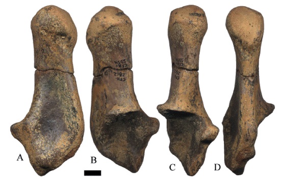 Los fragmentos proximales de falanges I (Figura 16) posiblemente de ejemplares juveniles, tienen la faceta articular proximal dorso-ventralmente cóncava, con una depresión ventral para la quilla metapodial, la diáfisis es recta y esbelta. La superficie posterior es ligeramente cóncava y la superficie dorsal convexa. En el ejemplar ilustrado en la Figura 16C, se observan marcas de Gnatichnia posiblemente de cocodrilo. El ejemplar CFM-2609 (Figura 17A) tiene el ligamento suspensor en forma de "W" no simétrica; mientras que en el CFM-3099 (Figura 17B), el ligamento suspensor tiene forma de "W" simétrica. El único fragmento distal de falange I que se conservó, tiene regular conservación y tróclea estrecha. Las falanges II (Figura 17 C-D) con buena conservación, la faceta articular proximal es cóncava antero-posteriormente y la tróclea distal estrecha.