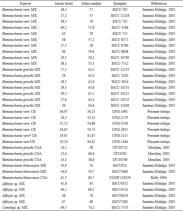 Abreviaturas institucionales: CFM, Colección de Fósiles del Museo Nacional de Costa Rica; IGCU, Instituto de Geología, Ciudad Universitaria; UNAM, Universidad Autónoma de México; UCMP, University of California Museum of Paleontology y UF, Vertebrate Paleontology Collection, Florida Museum of Natural History.