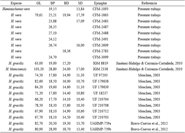 Hemiauchenia veraMatthew, 1909 en Dalquest (1980), págs. 115-117, figs.5 c-d, 6.