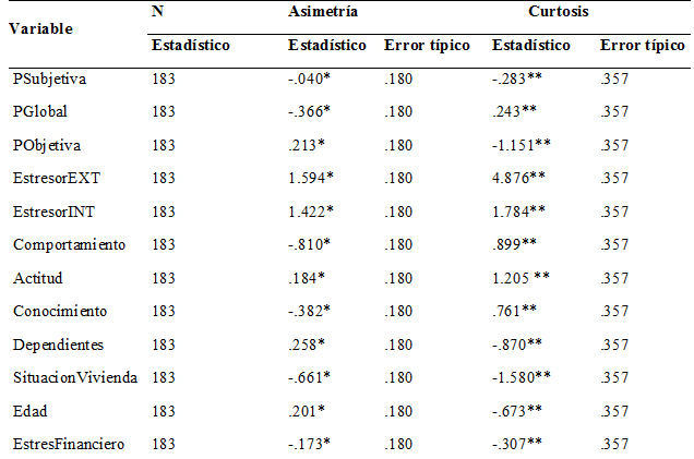 Para el análisis exploratorio, se realizó la prueba de normalidad. La tabla 1 muestra que los valores de la asimetría están por debajo de 3 y los valores de la curtosis, estos están por debajo de 8 (García, 2011). Los resultados revelan la inexistencia de problemas de asimetría y curtosis en los constructos observados, requisito previo para el análisis de datos mediante ecuaciones estructurales.