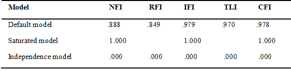 Los valores de los índices incrementales de ajuste, se puede verificar que el indicador normal de ajuste (NFI) es .888, el coeficiente Tuker-Lewis (TLI) es .970 y el índice de comparación de ajuste (CFI) es .978. Es decir, todos los indicadores muestran un buen ajuste del modelo ya que los valores reportados están por encima del umbral de .9 (Hair, Anderson, Tatham y Black, 2010). Ver tabla 10.