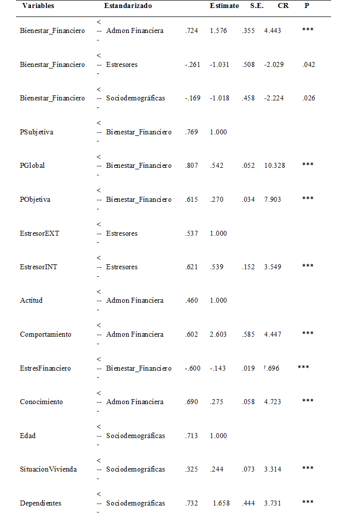 La tabla 8, muestra las estimaciones (Estimate) de los parámetros del modelo, el error estándar aproximado (S.E.), la proporción crítica (C.R.), la significancia (P) y las estimaciones estandarizadas de los parámetros. Las variable latentes exógena Admon Financiera influye sobre la variable latente endógena Bienestar_Financiero, tiene una proporción crítica de 4.443, la cual es mayor que 2; tiene un valor estandarizado de .724, además el parámetro es significativamente diferente de cero al nivel .001 (García, 2011). Los valores del estadístico p cumplen con valores de p <.05, por lo tanto, todos los parámetros estimados son significativos. Los valores estandarizados muestran que los estresores tienen un impacto negativo de 26.1%, sobre el bienestar financiero. La administración financiera tiene un impacto positivo sobre el bienestar financiero de 72.4%. Las características sociodemográficas tienen un impacto negativo de 16.9% sobre el bienestar financiero. El bienestar financiero tiene un impacto negativo de 60% sobre el estrés financiero.