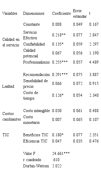 lo que indique es que la relación de cada una de las variables que la significancia de cada uno de los coeficientes de las dimensiones de las variables independientes, con lo que se puede apreciar es que de las cuatro dimensiones que forman calidad en el servicio el que no explica nada de la satisfacción es la calidad potencia, mientras que el profesionalismo que muestra el personal tiene una alta significancia de 0.01, con una relación positiva al igual que servicio efectivo pero con una significancia de 0.05. Al analizar la variable lealtad, se encuentra que la recomendación tiene una alta significancia de 0.01 y afecta de manera positiva a la satisfacción, el costo del tiempo también podría afectar la satisfacción, pero, tiene muy poca significancia y la sensibilidad del precio no tiene ninguna relación. De igual forma los costos cambiantes se muestra que no pasan las pruebas estadísticas de significancia por lo que se rechaza toda relación con la variable dependiente. Cuando se observa la variable tecnologías de la información y comunicación solo la dimensión beneficios de TIC tiene un efecto positivo sobre la satisfacción, por lo que las tres hipótesis planteadas solo se prueban de manera parcial.