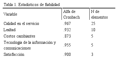 Para pedir cada una de las variables independientes se desarrolló un análisis de la literatura donde se consultaron varios estudios para la variable “calidad en el servicio” se analizaron siete dimensiones como: el profesionalismo, la confiabilidad, la sensibilidad, la garantía, la empatía, la atención del personal y la calidad potencial (Silveira & Silva, 2011; Velázquez & Contrí, 2011; Yuen & Thai, 2015; Garga & Bambale, 2016); con un total de veinte ítems utilizando una escala de Lickert de cinco puntos; para la variable “lealtad” se utilizaron cuatro dimensiones: la comunicación boca a boca, la intenciones de contratación, la sensibilidad al precio, y el costo de tiempo (Yuen & Thai, 2015; Garga & Bambale, 2016; Velázquez & Contrí, 2011; Setó, 2003; Silveira & Silva, 2011; Ghazali, Arnott, & Mutum, 2011), con diez ítems; la variable “switching cost”, fue medida con dos dimensiones el costo monetario y el costo intangible (Matzler, Strobl, Thurner, & Füller, 2015; Ghazali, Arnott, & Mutum, 2011; Silveira & Silva, 2011; Mejía-Argueta, Higuita-Salazar, & Hidalgo-Carvajal, 2015; Velázquez & Contrí, 2011; Yuen & Thai, 2015; Shiau, Hsu, & Wang, 2009), con cinco ítems; la variable “tecnología de la información y comunicación” con dos dimensiones intensidad y beneficios (Gil, Berenguer, Ruiz, & Ospina, 2015; Shiau, Hsu, & Wang, 2009), también con cinco ítems; y la variable dependiente “satisfacción” se utilizaron tres ítems (Saura, Pérez, Contrí, & González- Gallarda, 2005; Velázquez & Contrí, 2011; Setó, 2003). El resumen del instrumento de puede apreciar en el anexo 1.