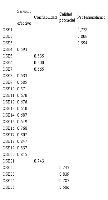 Por lo anterior, se desarrolla el análisis con el método VARIMAX donde se analiza la rotación de factores. De acuerdo con la investigación previa de la variable independiente “Calidad en el servicio” se contemplaban siete dimensiones: profesionalismo, confiabilidad, sensibilidad, empatía, atención del personal y calidad potencial; y conforme al análisis factorial confirmatorio que se puede apreciar en la tabla 3, donde se identifican cuatro dimensiones, con una nueva reagrupación de los ítems y se nombraron conforme a los mismos de la siguiente manera: servicio efectivo, confiabilidad, calidad potencial y profesionalismo, por lo cual para esta variable ahora está formada por nuevos componentes.