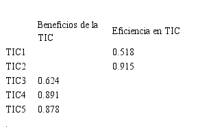 En la variable tecnologías de la información y comunicación se tiene un pequeño cambio donde se aprecia que el factor beneficios de las TIC tiene tres ítems y el factor eficiencia en TIC dos respectivamente (Tabla 6).