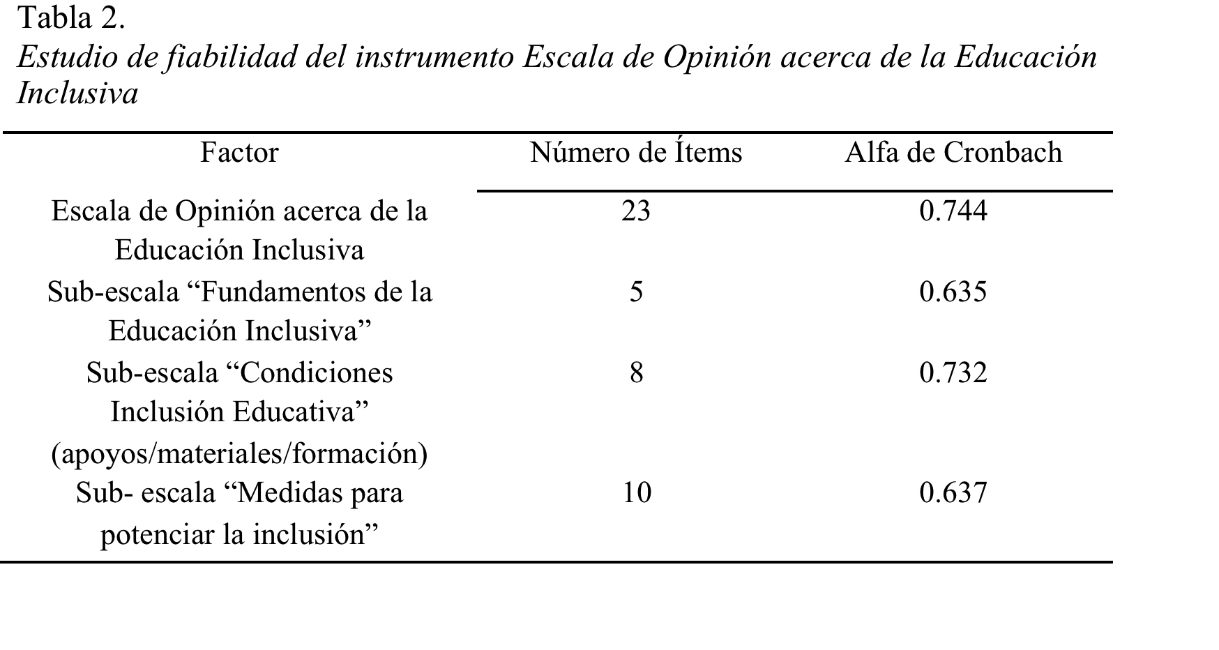 El instrumento utilizado fue la Escala de Opinión acerca de la Educación Inclusiva. El instrumento fue diseñado y adaptado por Cardona y Bravo (2010) basándose en otros instrumentos parecidos que fueron utilizados en estudios previos (Cardona, 2006; Cornoldi, Terreni, Scruggs, & Mastropieri, 1998). Se trata de una escala multidimensional con valores de fiabilidad (alfa de Cronbach= .84) y validez (IVC= 0.95) muy buenos.