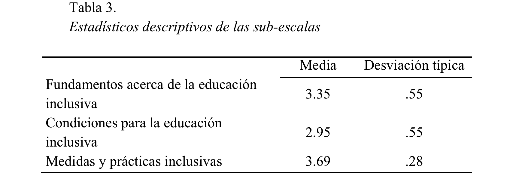 La media de los docentes con respecto a los fundamentos de la inclusión (ver tabla 3), fue M=3.35 (DE= .55), por encima del punto medio de la escala (x=2.50) señalando por lo tanto una opinión claramente favorable hacia los principios fundamentales de la inclusión.