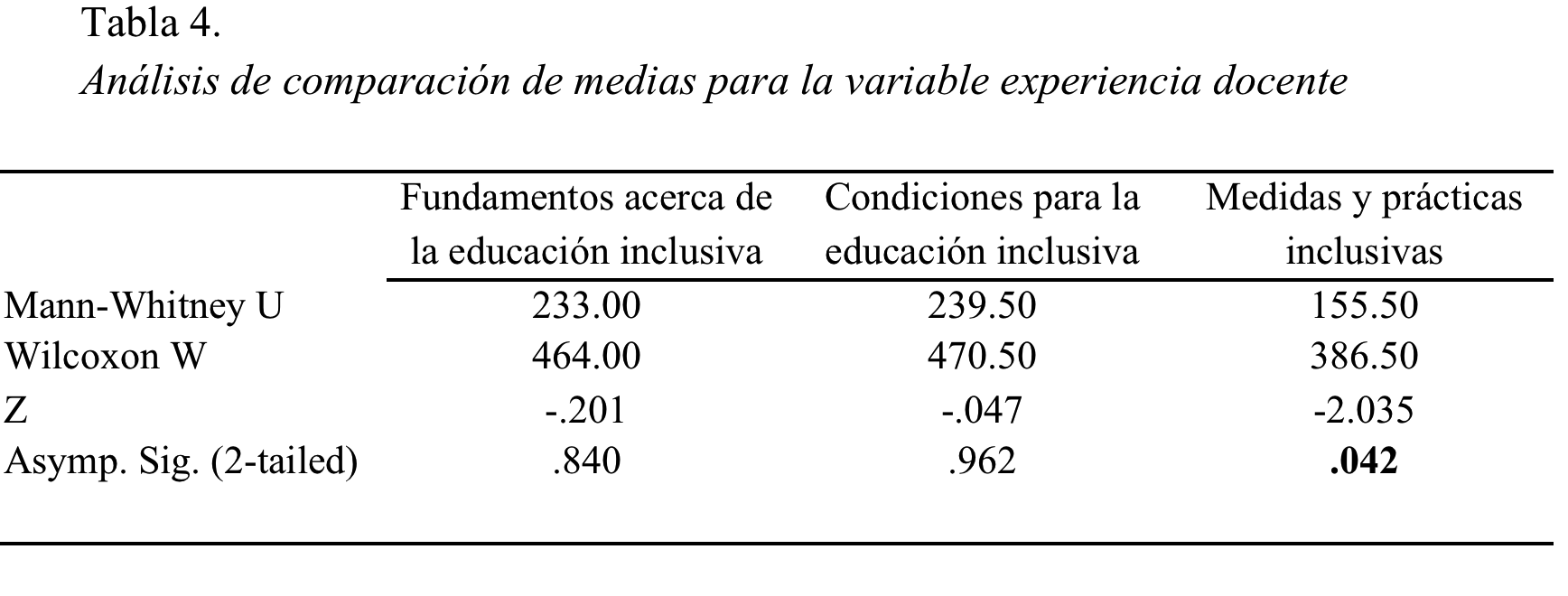 Se realizaron los estudios de comparación de medias con los factores de la escala tomando en cuenta la variable experiencia docente. Los análisis presentados en la tabla 4, muestran que hay una diferencia estadísticamente significativa (p≤.05) en el factor “medidas y prácticas inclusivas”. Esta diferencia señala puntuaciones mayores del grupo con más años de experiencia.