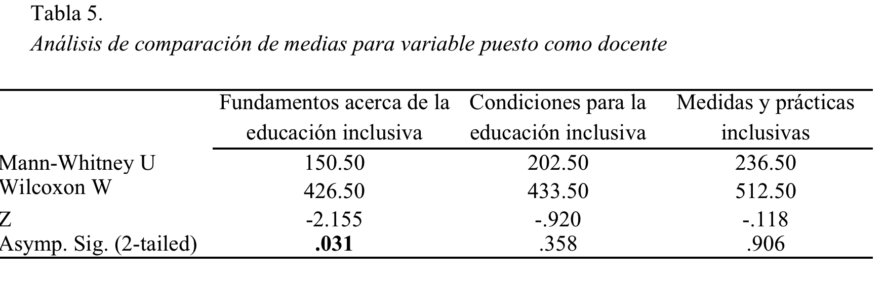 En segundo lugar, se realizaron las pruebas con respecto a la variable cargo como docente. En la tabla 5 se muestra el análisis de comparación de medias, evidenciando una diferencia significativa en el factor “fundamentos acerca de la educación inclusiva” (p= .031). Las docentes de español tienen una opinión más favorable hacia la educación inclusiva acerca de los principios generales de la misma que los docentes de inglés.