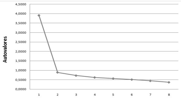 El diagrama de autovalores de la Figura 1 muestra un salto brusco considerable entre el primer y el segundo autovalor, mientras que a partir de este último todos los autovalores se alinean en forma semi-horizontal cerca del eje de abscisas.