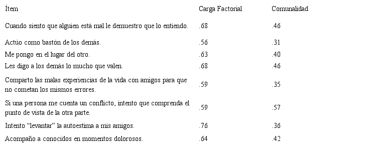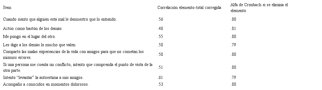 Sobre estos ocho ítems se llevó a cabo el análisis de la consistencia interna, obteniendo unas correlaciones ítem-total corregidas adecuadas, así como un índice alfa de Cronbach y glb satisfactorios para ambos cuestionarios. De esta forma, se ha conseguido operacionalizar la Conducta Empática mediante una escala unidimensional compuesta por ocho ítems. Los aspectos de la Conducta Empática a los que atañen los ítems son: la demostración de la comprensión del otro, la capacidad de ubicarse en el lugar del otro, la capacidad de apoyar al otro, realizar refuerzos positivos mediante la palabra, compartir experiencias, la realización de acciones que permitan el aminoramiento de conflictos, el apoyo emocional en general y en momentos dolorosos. Los ítems abarcan distintas intensidades de beneficio hacia el otro.