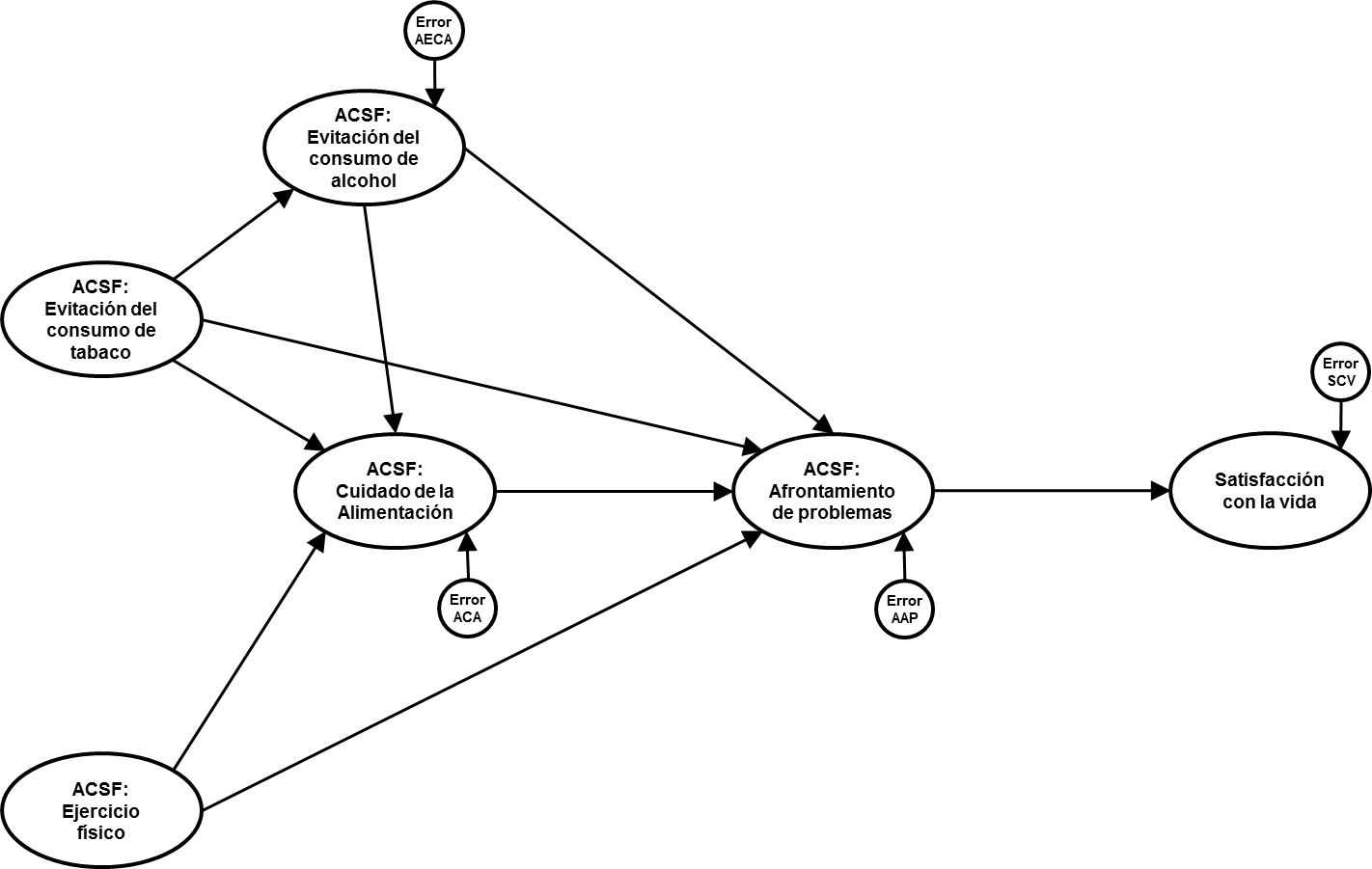 Por su parte los factores ejercicio físico, evitación del consumo de alcohol y cuidado de la salud física influyen indirectamente de forma significativa en la satisfacción con la vida a través del factor afrontamiento de problemas. Finalmente, se puede observar que los signos de los efectos directos corresponden a los esperados.