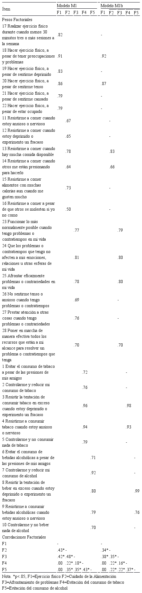Escala de autoeficacia en el cuidado de la alimentación y salud física (EACASF). Los resultados globales del análisis factorial confirmatorio (GFI .844; RMSEA .066; SRMR .063; AGFI .810; TLI .926; CFI .926; CMIN/DF 2.196; AIC 877.206) para el modelo M1, modelo de cinco factores acorde a la distribución original de los ítems en el EACASF, indican que el modelo de medición es aceptable. El conjunto de los cinco factores del modelo M1 explican aproximadamente el 69% de la varianza. Sin embargo, cinco de los 28 ítems saturan por debajo de .70 en su dimensión prevista (ver Tabla 1). Respecto a la validez discriminante, se observan correlaciones moderadas entre los factores.