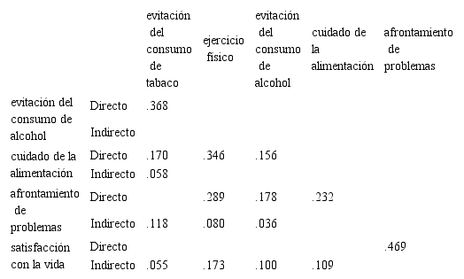 Tal y como se muestra en la tabla 5 el efecto directo más elevado fue el que produce el factor afrontamiento de problemas en la satisfacción con la vida (β=.47, p<.001), seguido del producido por evitación del consumo de tabaco sobre la evitación del consumo de alcohol (β=.37, p<.001) y el ejercicio físico sobre el cuidado de la alimentación (β=.35, p<.001). De manera similar destaca el efecto del ejercicio físico sobre el afrontamiento de problemas (β=.29, p<.001). Por otro lado, los resultados muestran que los factores ejercicio físico, evitación del consumo de tabaco y de alcohol ejercen un efecto indirecto significativo sobre la satisfacción con la vida a través de los factores cuidado de la alimentación y afrontamiento de problemas.