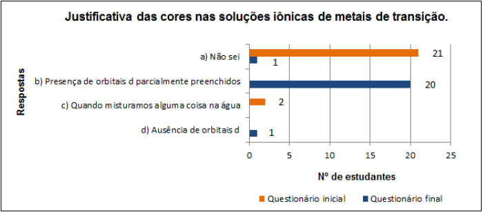 Dessa forma, inicialmente, nenhum estudante soube explicar corretamente essa questão, por meio dos aspectos científicos envolvidos. Porém, no questionário final, em que os estudantes foram investigados novamente sobre a presença de cor em soluções iônicas de metais de transição, a maioria conseguiu relacionar com a presença de elétrons nos orbitais d parcialmente preenchidos, 1 estudante apenas não conseguiu explicar e outro confundiu e mencionou que a presença de cor era devido a ausência de elétrons nos orbitais d. Algumas respostas dos estudantes foram: