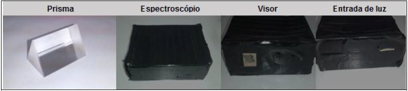 Ainda no primeiro momento, os estudantes realizaram à primeira atividade experimental, denominada: “Decomposição da luz branca”, em que utilizaram um prisma de vidro óptico e um espectroscópio caseiro (Figura 3). Para a realização dessa atividade experimental a presença de luz foi indispensável, para a visualização das cores.