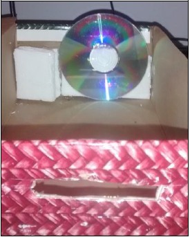 Para a realização da primeira atividade experimental, foi confeccionado um equipamento para a visualização das cores, utilizando alguns materiais de fácil acesso presentes no nosso cotidiano, tais como: caixa de sapato, isopor, CD e fita adesiva. A construção desse instrumento consistia em fazer duas fendas paralelas, uma maior (abaixo) e outra menor (acima) em uma das laterais menores da caixa de sapato. O isopor foi utilizado para fixar o CD no interior da caixa, sendo que a parte gravável deve estar voltada para as fendas (Figura 4).