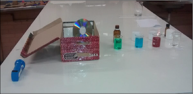 Nessa atividade, os estudantes colocaram no interior do equipamento confeccionado, uma amostra de cada vez, entre as fendas e o CD e inseriram a lanterna na fenda inferior, fazendo com que a luz branca incidisse sobre a amostra. Através da fenda superior eles conseguiram verificar no CD a cor que mais se destacou, como por exemplo, a amostra de coloração vermelha apresentou no CD várias cores, porém a cor que mais se destacou foi a verde, referente aos comprimentos de onda que foram absorvidos pela amostra, ou seja, a cor complementar. A Figura 5 apresenta os materiais e as amostras utilizadas nesse experimento.