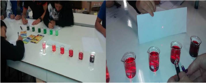 Para a realização dessa prática experimental, os estudantes direcionaram os feixes de luz dos lasers vermelho e verde nas diferentes amostras de corantes. Essa prática permitiu a visualização da absorção seletiva, ou seja: corante de cor vermelha absorve somente os comprimentos de onda da luz do laser verde, ou seja, da sua cor complementar e verificaram que o oposto ocorre com o corante de cor verde. A Figura 6 apresenta a realização da segunda atividade experimental pelos estudantes.