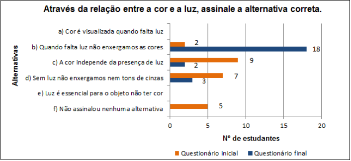 A Figura 7 representa um gráfico, que corresponde às alternativas escolhidas pelos 23 estudantes no questionário inicial e final sobre a relação existente entre a cor e a luz.