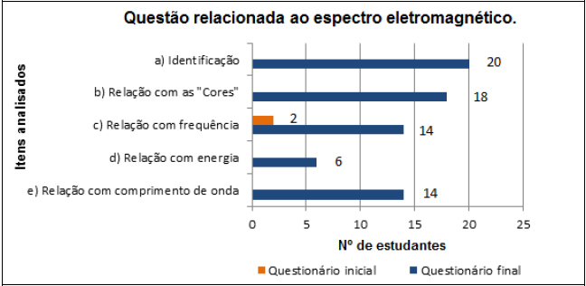 Em relação aos itens: a, b, d e e da questão que envolve a compreensão do espectro eletromagnético, identificamos que os estudantes inicialmente não sabiam a respeito do assunto. Conforme os comentários dos estudantes relacionados a esta questão, a maioria salientou que não haviam estudado sobre o tópico em questão. No questionário inicial, apenas 2 estudantes mencionaram que o espectro eletromagnético estava relacionado com a frequência das cores na região do visível (item c).