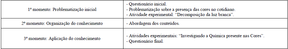 A oficina temática em questão foi elaborada conforme os pressupostos teóricos dos três momentos pedagógicos, descritos por Delizoicov, Angotti e Pernambuco (2009). Os objetivos da oficina temática foram: Relacionar a temática Cores com o cotidiano dos estudantes, abordar o experimento de Newton sobre as cores, relacionar a presença de luz com as cores, compreender como ocorre a percepção das cores, auxiliar os estudantes na interpretação do espectro eletromagnético e do disco de cores, abordar a presença das cores em corantes orgânicos, entender por que os elementos químicos do bloco d da tabela periódica apresentam ou não cor e, por fim, realizar experimentos para auxiliar na compreensão dos diversos conteúdos abordados na oficina.