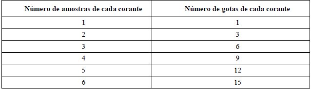Na segunda atividade experimental dessa oficina, os estudantes utilizaram 6 amostras de corantes alimentícios vermelho e verde, que foram preparadas, utilizando béqueres de 50 mL para adicionar 30 mL de água em cada um deles. Os corantes foram adicionados em cada béquer em diferentes quantidades (Quadro 3). Além disso, também foi necessário raios lasers de feixes de luz vermelho e verde.