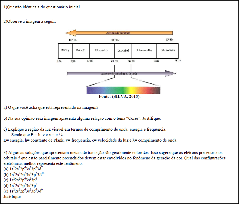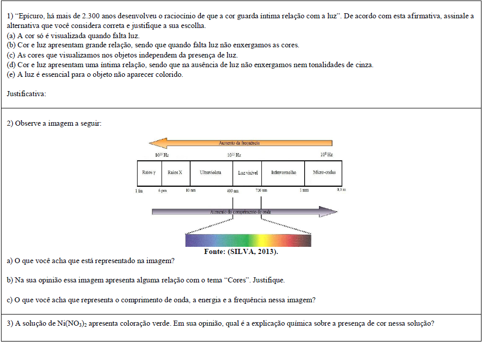 Inicialmente, como objetivo de conhecer as concepções prévias dos estudantes, aplicou-se um questionário investigativo, contendo questões relacionadas à temática cores como: luz, espectro eletromagnético (comprimento de onda, frequência, energia) e soluções, conforme o Quadro 2.