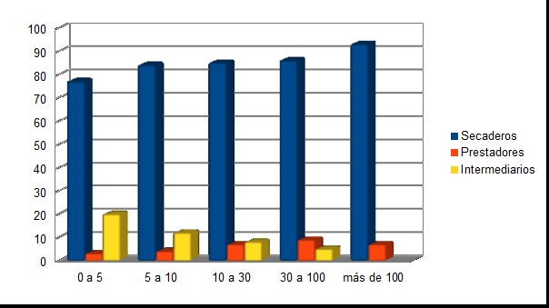 Las estadísticas del INYM determinan que el ingreso de hoja verde en secadero registra un aumento en el volumen, tanto en Corrientes como en el Nordeste de la provincia de Misiones. La producción primaria presenta una importante concentración, ya que el 10% de los productores aportan casi el 50% de la misma. Con respecto al destino de la yerba (ver Gráfico 3), los estratos de 0 a 10 hectáreas entregan en un 20% a los secaderos a través de los intermediarios y prestadores de servicio (cosecha y transporte). En el otro extremo, los productores de más de 100 hectáreas entregan en forma directa al secadero más del 90% de la producción. Tanto las cooperativas no integradas como los secaderos privados se abastecen principalmente de los productores de menos de 30 hectáreas. Aunque en volumen la compra de hoja verde de las empresas integradas es muy importante para todos los estratos, su mayor abastecimiento de materia prima está dada por los productores de más de 100 hectáreas. Las cooperativas integradas se abastecen principalmente de los estratos intermedios (INYM, 2013: 7).