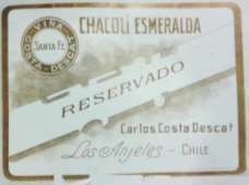 La Figura 15 es de 1922 y pertenece a Carlos Costa Descat de Los Ángeles. Es una etiqueta en blanco y dorado que utiliza la tipografía y la diferencia de cuerpo de las letras para destacar los elementos. El signo de la marca “Chacolí Esmeralda” puede aludir a la corbeta que participó del Combate Naval de Iquique. Destaca también el lugar de procedencia, Los Ángeles, con una tipografía manuscrita, aproximadamente del mismo tamaño que la utilizada para el signo. También incluye el nombre de la viña y el de su productor. Aquí podemos decir que los datos de origen son los que destacan.