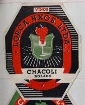 El segundo registro es de 1957. En comparación a la etiqueta analizada anteriormente, su diseño es más moderno y utiliza un particular contraste de colores para destacar los elementos deseados. La tipografía es la misma tanto para el signo y el nombre de los productores, solamente varían los tamaños. En el centro se encuentra la imagen de un campo como fondo y sobre este un escudo con una copa en medio y un racimo de uva que entra en ella. Por un lado, el escudo nos remite a la nobleza, atributo que entrega prestigio y da confianza. Por otra parte, el campo, la copa y el racimo de uva nos hacen pensar en las bondades del vino como producto de la tierra. Si conceptualizamos estos elementos, podemos inferir el mensaje “del campo a la copa”. A diferencia de la anterior, no se encuentran referencias al lugar de origen del producto y es el nombre de los comerciantes “Lorca Hnos. Ltda.” el que se destaca como elemento principal de la identidad de este Chacolí. Los colores utilizados, el uso de un escudo y el apellido de los productores también nos hace pensar en el País Vasco y su bandera ikurriña, lugar de donde proviene la inspiración para crear esta bebida (Lacoste et. al., 2015).