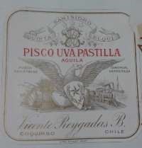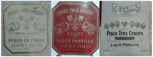 También nos pareció interesante destacar el código cromático que se utiliza en las etiquetas del pisco “Tres Cruces” para diferenciar sus variedades. Etiqueta blanca con dorado para pisco de Italia, rojo con dorado para pisco pastilla y blanco con negro para identificar el reservado. Detectamos que esto se repite posteriormente con otras marcas de pisco. Años más tarde, al rediseñar sus etiquetas, “Tres Cruces” deja de identificar el tipo de cepa por escrito pero lo mantiene en el código cromático.