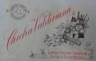 En relación a las Chichas, hemos encontrado variedades tanto de manzana como de uva, en general, ambas expresamente identificadas en el membrete. Los diseños de estas etiquetas son variados y utilizan diferentes signos para identificarse. Podemos observar referencias al lugar de origen, a tradiciones o elementos nacionales. Particularmente en la Chicha de Manzana se utiliza con mayor frecuencia la imagen del fruto. Así, la Figura 6 se presenta como “Chicha Valdiviana”; aquí el elemento geográfico es lo importante en su diferenciación. Además de eso, nos entrega una imagen de las diferentes etapas del proceso de producción mostrándonos el fruto, manzanas en ramas, la bodega y finalmente botellas de chicha.
