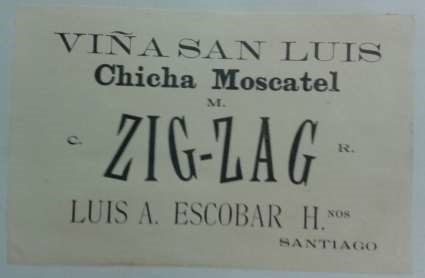 La Figura 7 no tiene texto pero en el registro se presenta como “Una Cueca”. En esta etiqueta la tradición es el elemento fundamental y relaciona el ambiente festivo del baile nacional de Chile con el consumo de la chicha. La Figura 10, en contraste, no presenta imágenes y utiliza el código lexográfico para destacar la información. El nombre “Zig-Zag” es lo que más sobresale, luego en negrita se ve la esencia del producto “Chicha moscatel” y finalmente su origen, “Viña San Luis”. Aquí el tamaño y la fuente de las letras es lo que da forma a la etiqueta.