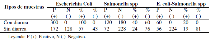 De un total de 300 muestras analizadas de crías de alpacas con diarreas, se encontraron positivos el 100 % (300/300) a Escherichia coli, 40,0 % (120/300) Salmonella spp. y 20% (120/300) asociados a Escherichia coli-Salmonella spp. con mayor porcentaje de presencia de Escherichia coli y Salmonella spp. De igual forma, 300 muestras evaluadas de crías de alpacas sin presencia de diarreas se encontraron positivos en 57,0% (172/300) a Escherichia coli, 24,0 % (24/300) a Salmonella spp. y 19,0% (56/300) asociados a E. coli-Salmonella spp. (Tabla 1), apreciándose con menor prevalencia de Escherichia coli y Salmonella spp. a las muestras de crías de alpacas con diarreas.