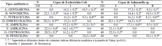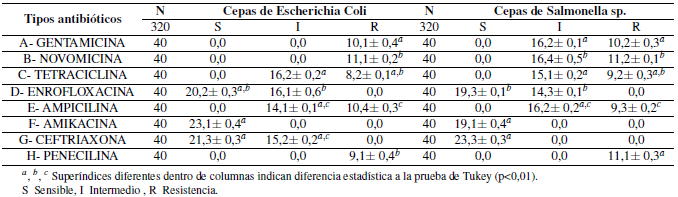 La Escherichia coli y Salmonella spp. aisladas de muestras de heces de crías de alpacas sin enteropatías diarreicas presentaron diferencias significativas (p<0,01) de resistencia antibiótica frente a Gentamicina, Tetraciclina, Ampicilina, Penicilina y Novomicina, y fueron sensibles a Novomicina, Enrofloxacina, Amikacina y Ceftriaxona (Tabla 3).