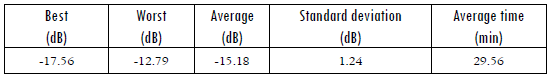 Finally, Spiral Optimization was used in the frequency range 0.1-20 GHz. The main statistics are shown in Table 16, and both designs (the one achieved in this work, and the one reported by (23)) are summarized in Table 17. Even if the design found by MLPSO was 1 dB better than the one found by Spiral Optimization, the latter is 1.5 mm thinner, so it can be attractive for some applications. The frequency response of both designs is shown in Figure 13.