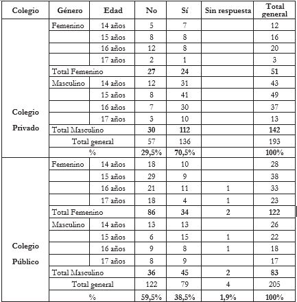 Sumado a lo anterior —y según la pregunta abierta relacionada con la confianza que sienten en las redes sociales—, la mayoría de los estudiantes del colegio privado (70,5%) asumen de manera positiva la confianza en las comunicaciones virtuales. Sin embargo, aluden a que ahora más que antes, seleccionan mejor sus contactos que, en muchos casos, son sus mismos compañeros del Colegio. A pesar de esto, se evidencia contradicción en la respuesta, ya hay una tendencia a sentir desconfianza, pues según las respuestas abiertas se encontró que “no hay seguridad de que se está chateando con la persona que se cree”. Por otro lado, se puede ver que, en el colegio público, no hay la confianza esperada en estos medios (59,5%), mientras que el 38,5% afirman que sí la sienten.