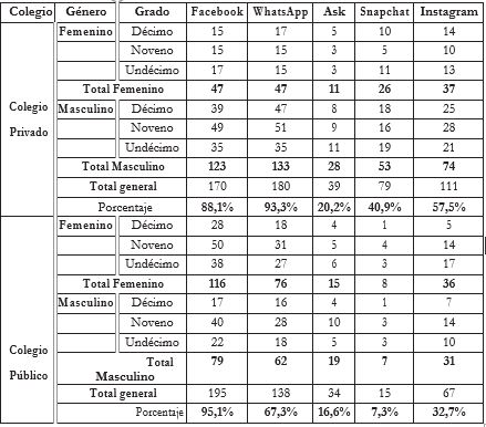 Es así como, según la Tabla 1, la red social más usada es Facebook, privado (88,1%) - público (95,1%), en comparación con Instagram, (privado 57,5% - público 32,7%), la cual está en un lugar importante entre los adolescentes, especialmente para aquellos del colegio privado, ya que permite alcanzar contenidos concretos y la participación de otros usuarios. En cuanto a la mensajería instantánea, la aplicación a la que más acuden los adolescentes escolarizados es WhatsApp, (privado 93,3% - público 67,3%), en donde se puede interactuar a través de fotos, notas de voz, anotaciones y envío de información, de manera ágil, efectiva y perdurable. El uso de Snapchat6, es otra herramienta usada por los estudiantes de estas instituciones educativas, pero en menor medida: privado (40,9%) - pública (7,3%). Ask.com es un motor de búsqueda que ingresa a redes virtuales sociales y con información concreta hace la localización dentro de la Red; sin embargo, y según las respuestas obtenidas en la encuesta, no es muy utilizado, privado (20,2%) - público (16,6%).