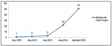 Considerando apenas empreendimentos que se encaixassem na definição de Food Truck delineada nesta pesquisa (item 3.1), foi possível identificar um universo de 51 Food Trucks até abril de 2015, a saber: 1) Vai Bem (Gelados); 2) Dona Esponja; 3) Vinny’s (artisan pizza); 4) El Perro Negro; 5) Pastéis da Tia Neuza; 6) Zagaia; 7) Bistruck; 8) Tony’s American Street Food; 9) Bistrô Itinerante; 10) Sucopira; 11) Los Batateiro’s; 12) Kim Kebab; 13) Belgrado Burger; 14) Crepe Voyage; 15) Malibu; 16) Arroz Carreteiro (food truck); 17) Los Kactus; 18) Geléia Burger; 19) Chilli na Rua; 20) Açaí da Capital; 21) Kombinni Coffee Truck*; 22) Dozai Urban Food; 23) Burger Truck; 24) Potatoes e Batatas; 25) Fusbier; 26) Churros do Tio; 27) Le Hotdog Parisien et Crepe; 28) Maria Gulosice; 29) Corina; 30) Shukran Rock & Food; 31) Naked Barbecue; 32) Baguet’s Truck; 33) Mexicoletas; 34) Raf Food Truck; 35) Komboleria; 36) Ribs on the Truck; 37) Operação Pizza; 38) Corujinha Food Truck; 39) Hamburgueria do Francês; 40) Dona Fininha; 41) Divina Tapioca; 42) Sushi Dog; 43) Como Food Truck; 44) Açaí Truck; 45) Poutinerie do Rondy; 46) Mix Açaí; 47) Gutrailler; 48) Braz Bier; 49) Fresh Food Truck; 50) Garapa Food Truck; e 51) Latifas Food Truck.