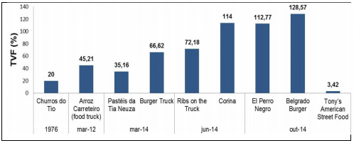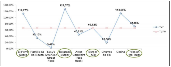 Assim, apenas os empreendimentos que apresentassem uma TVF superior a TVFM seriam considerados para o estudo. Por fim, para que pudesse ser feita uma comparação mais efetiva, os Food Trucks selecionados para a amostra deveriam cumprir mais um requisito, estarem dentro da mesma categoria de produto. Dessa forma, optou-se pelos Food Trucks que estivessem dentro da categoria de refeição.