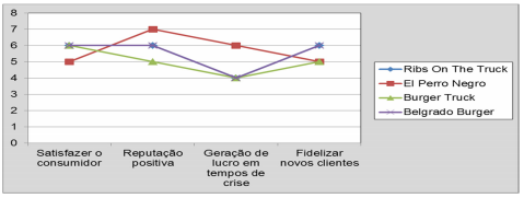 Visualizando o Gráfico 5, é possível observar que existe semelhança no desempenho entre as quatro empresas estudadas pois, no geral, todas apresentam bom desempenho para todos os indicadores. O El Perro Negro, apesar de ter um desempenho superior em gerar lucro em tempos de crise, mostra desempenho inferior em satisfazer o consumidor. Logo, não se pode dizer que os resultados são distintos entre essas organizações. Ainda que possuam um desempenho semelhante, sabe-se que a combinação dos recursos de cada organização contribui de forma significativa para o seu desempenho (Barney, 1991), identificado nas quatro empresas estudadas. O Gráfico 5 apresenta as variáveis de desempenho abordadas na entrevista e as respectivas empresas estudadas.