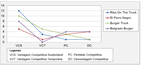 O Gráfico 6 permite visualizar, uma vez mais, a maior proximidade entre o Ribs On The Truck e o Burger Truck no que diz respeito aos arranjos de recursos encontrados dentro das empresas. Ainda é possível observar que essas duas organizações que estão atuando há mais tempo no mercado possuem números mais elevados de recursos geradores de VCS e ainda um número menor de desvantagens competitivas em relação às outras duas organizações. Como escreve Coyne (1986), se um produtor vende seus serviços, gerando lucro, ele dispõe de uma vantagem competitiva com os consumidores que optaram por comprar dele e não de seus competidores, e no caso dessas duas empresas, ao parecer isso essa vantagem é sustentável, em função de sua presença no mercado há mais tempo que as demais.