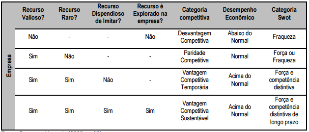 Como representado pelo Quadro 1, Barney e Clark (2007) estruturaram o modelo VRIO com base em quatro dimensões ou questões que devem ser consideradas sobre um recurso para determinar seu potencial competitivo: Valor, Raridade, Imitabilidade e Organização, sendo que a resposta para essas questões seria determinante para averiguar o grau de vantagem competitiva lograda pelo recurso, bem como sua sustentabilidade.