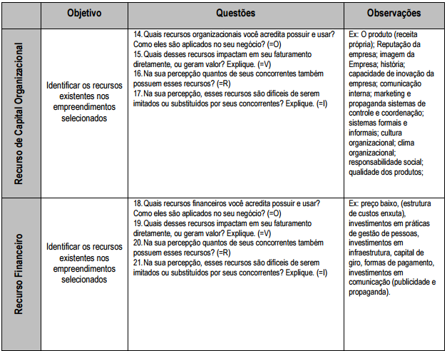 Para a condução da entrevista semiestruturada foi elaborado um roteiro (Vide Anexo 1) alinhado com os conceitos de recursos apresentados por Barney (1991), o modelo VRIO de Barney e Clark (2007) e os estudos encontrados que aplicaram o modelo.